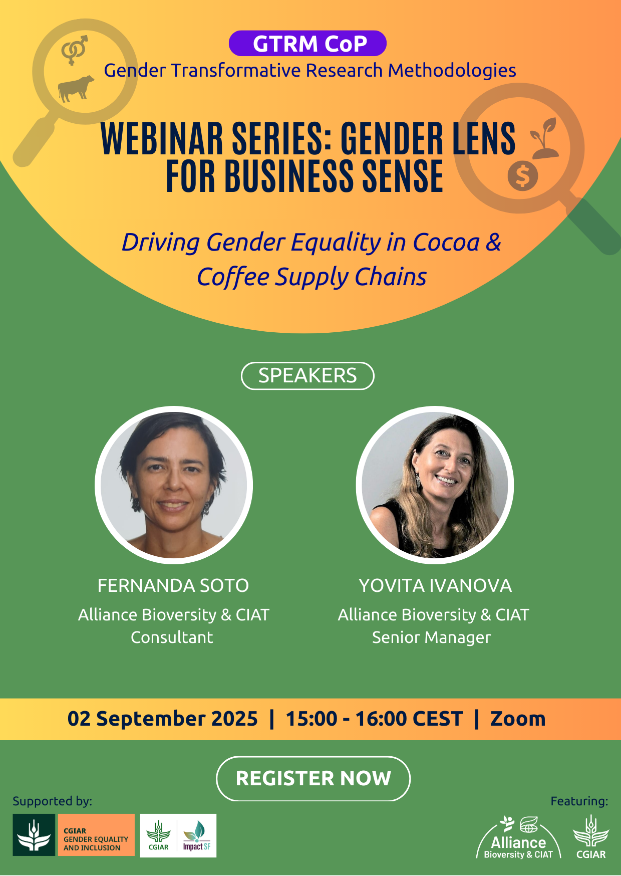 Webinar #4 in this exciting series Gender Lens for Business Sense, hosted by the Gender Transformative Research Methodologies (GTRM) community of practice, will feature two knowledgeable speakers working with Alliance Bioversity International & CIAT: