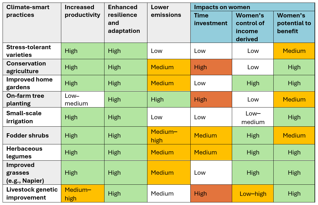 Specific climate-smart practices (see Table 1) varied in how they impacted time burden, income and women’s ability to benefit from increased productivity. All such impacts should be assessed when planning and promoting climate-change adaptation practices.