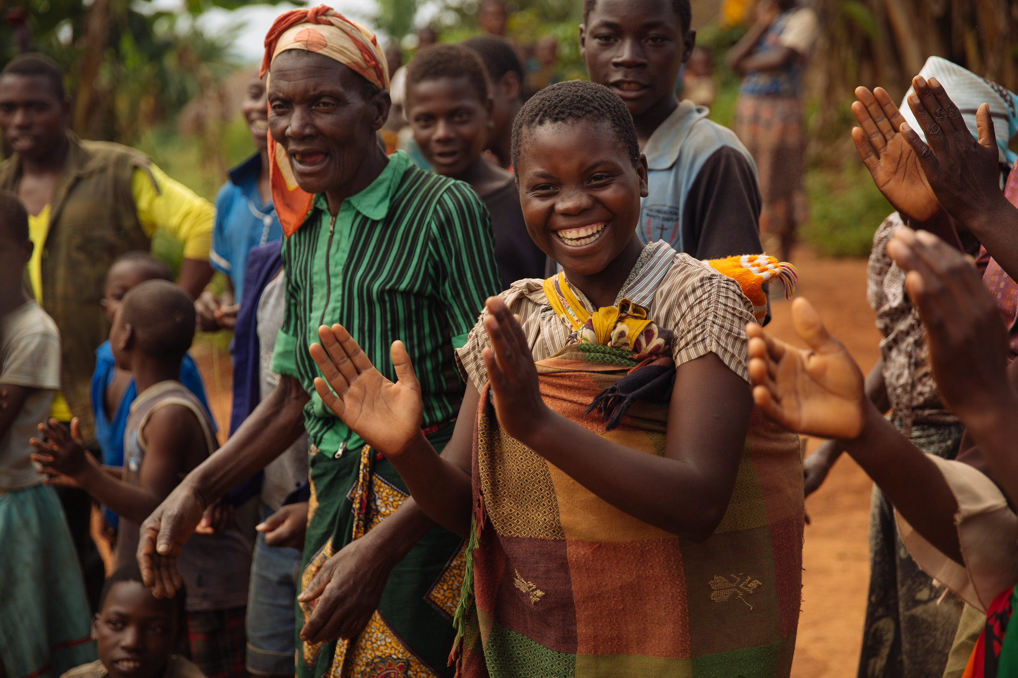 Young Woman with Baby on Back Laughs in a Group of Other Villagers in Malawi. Photo: M. Maher/IFPRI